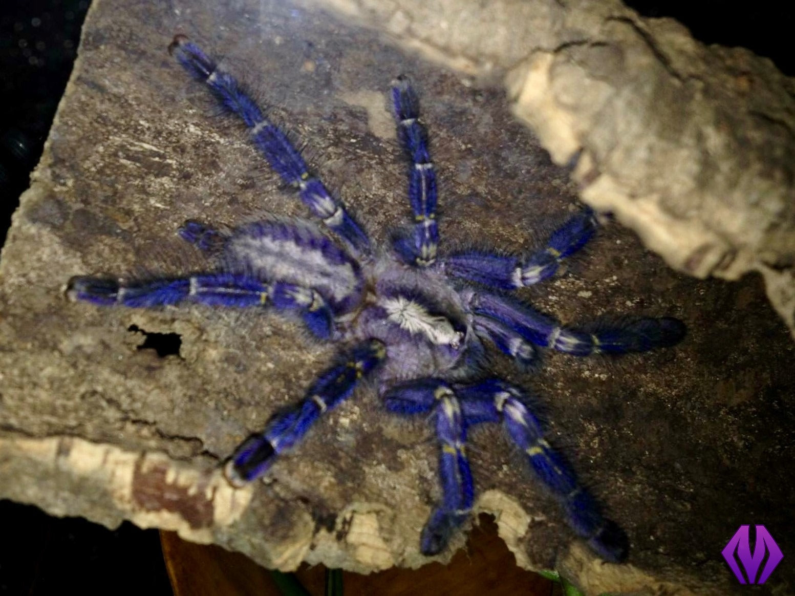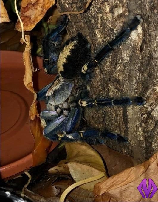 the sapphire ornamental tarantula (Poecilotheria metallica) is a fast-growing Indian arboreal spider. They are a distinct member of the genus because of their striking blue-black coloration and relatively small adult size. Spiderlings grow into their blue coloration but show the same patterning. P. metallica has neon yellow banding on the knees in stark contrast to their overall darker coloration. This species is generally less defensive than other Old World species, but quick to retreat. The Poecilotheria genus possesses “medically significant” venom and can move at light speed when disturbed, so keepers should take extra caution when working with these animals.