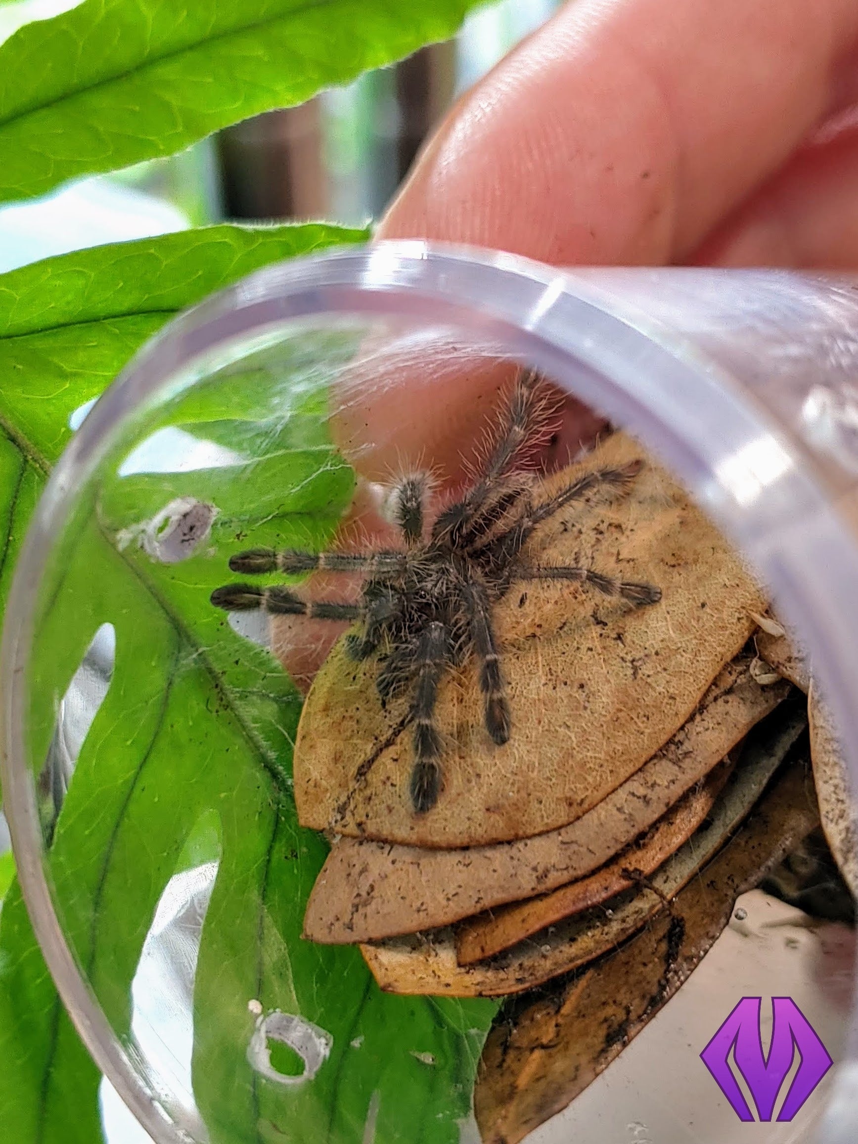 P. metallica max out at around 7” in diagonal leg span with 6” being the average for an adult female. Mature males can vary but are usually just as leggy. We set up all of our P. metallica adults in Exo Terra brand “Mini Tall” 12” x 12” x 18” glass enclosures, which we prefer due to their built-in cross-ventilation feature, double front-opening doors, locking mechanism, and clean look. The lid might pose an issue with tarantula claws getting stuck in the mesh, so consider replacing it with our PVC lid insert or replacement lid. We place a few cork bark pieces (hollow tubes are best) in a vertical position for hide options, fill the enclosure with 3-4” of megamix tropical substrate, plant a few foliage and vining plants, and provide a water dish. We set up spiderlings from 3/4”-2.5” in our TALL spiderling enclosure similarly, and juveniles from about 2-4” are housed in Exo Terra brand “Nano Tall” 8” x 8” x 12” enclosures. We’ve found that spiderlings tend to hide in leaf litter, so we always provide a thick layer of small oak leaves in our sling enclosures. There are anecdotal reports of this species choosing to live communally in the wild. We have raised spiderlings from the same sac communally ourselves for up to a year, although we do not recommend trying this because of the risk of cannibalism.