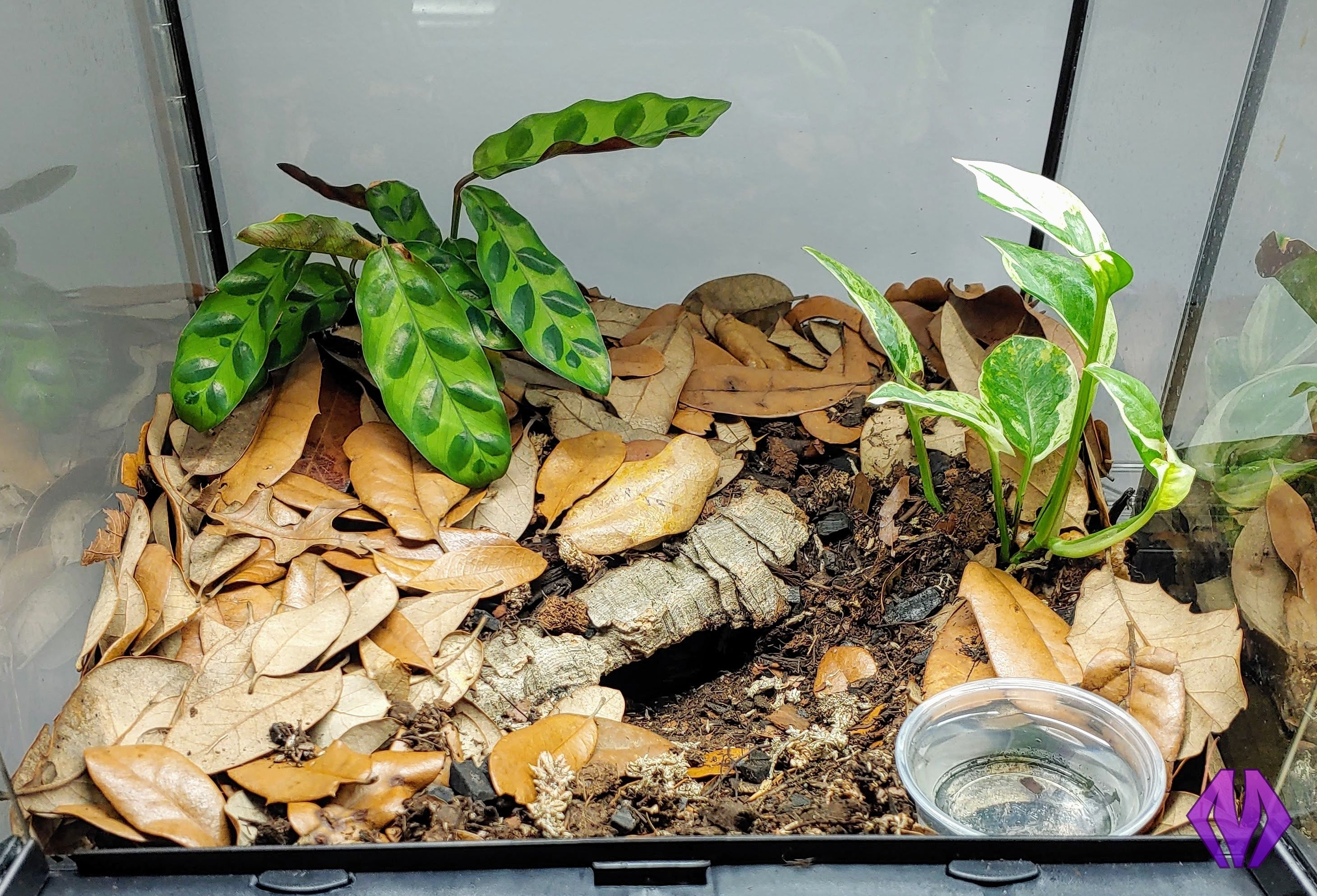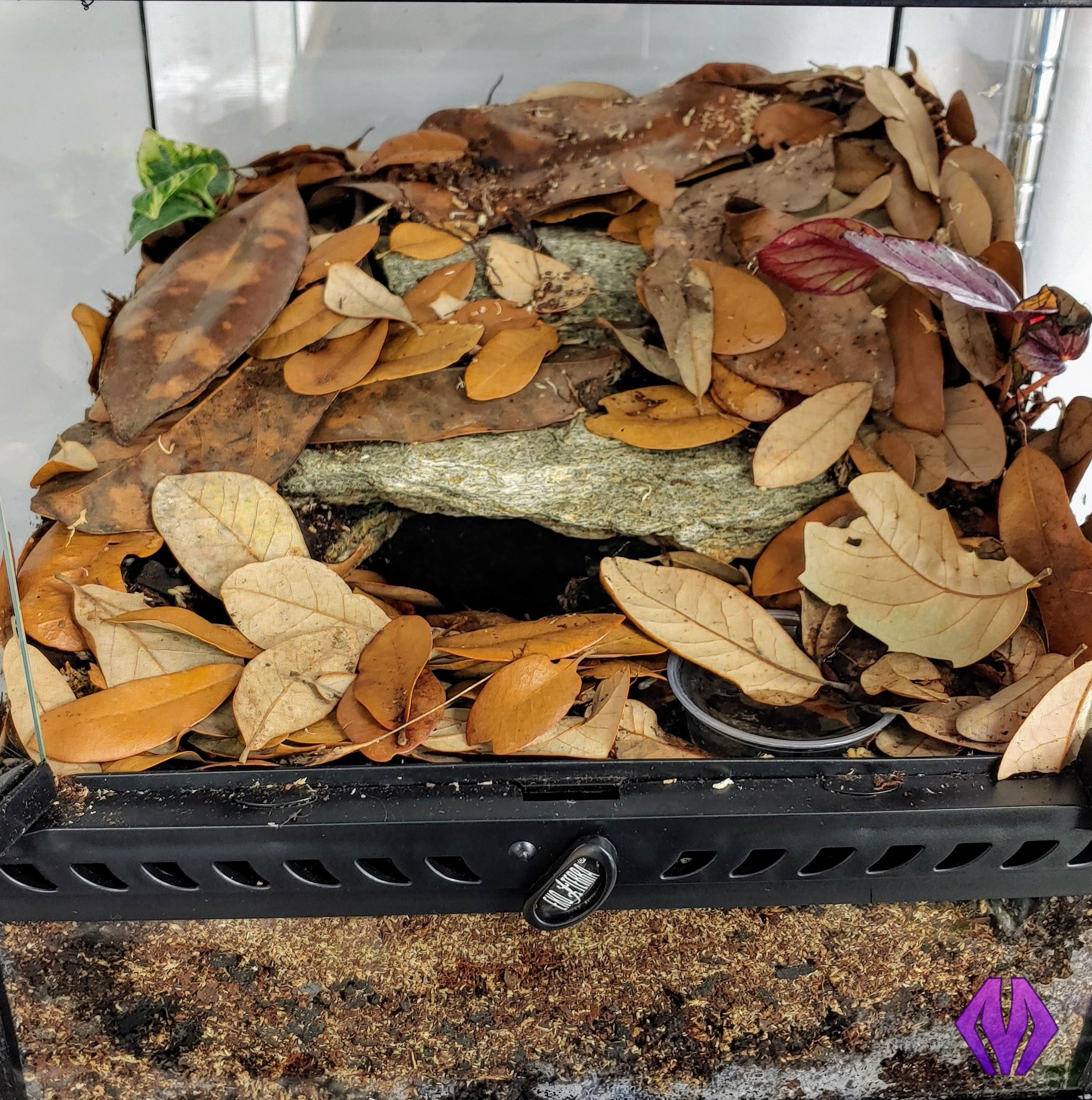 Female T. albos max out at around 6.5” in diagonal leg span with 5.5-6” being the average for an adult. Mature males can vary but are typically a bit smaller. We set up all of our curly hair adults in Exo Terra brand “Mini Wide” 12” x 12” x 12” glass enclosures, which we prefer due to their built-in cross-ventilation feature, double front-opening doors, locking mechanism, and clean look. The lid might pose an issue with tarantula claws getting stuck in the mesh, so consider replacing it with our PVC lid insert or replacement lid. Fill the enclosure with at least 5” of megamix tropical substrate, plant a few small tropical plants (optional), and provide a water dish. We usually partially bury a cork flat or tube as a starter burrow or an initial hide for the spider until it establishes its own burrow. We set up spiderlings from 3/4”-2” in our terrestrial spiderling enclosure similarly, and juveniles from about 2-4” are housed in Exo Terra brand “Nano Wide” 8” x 8” x 8” enclosures.