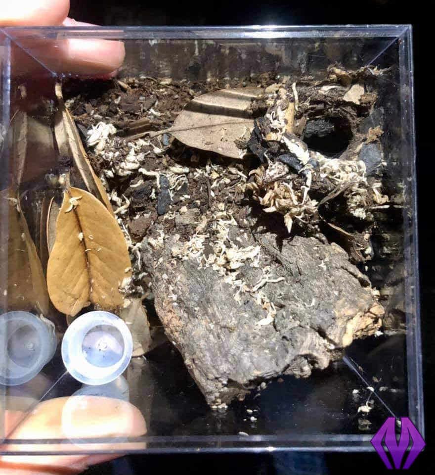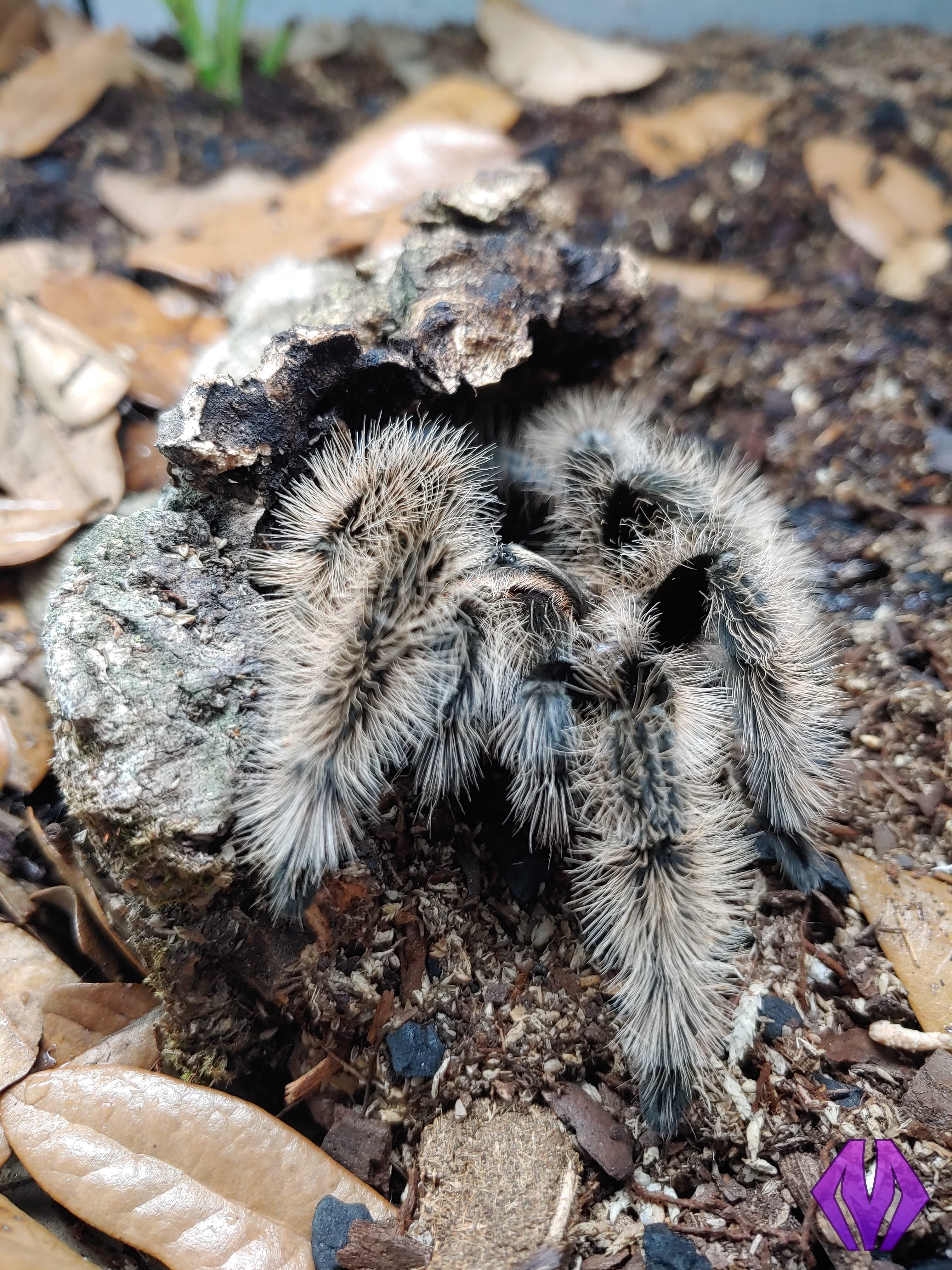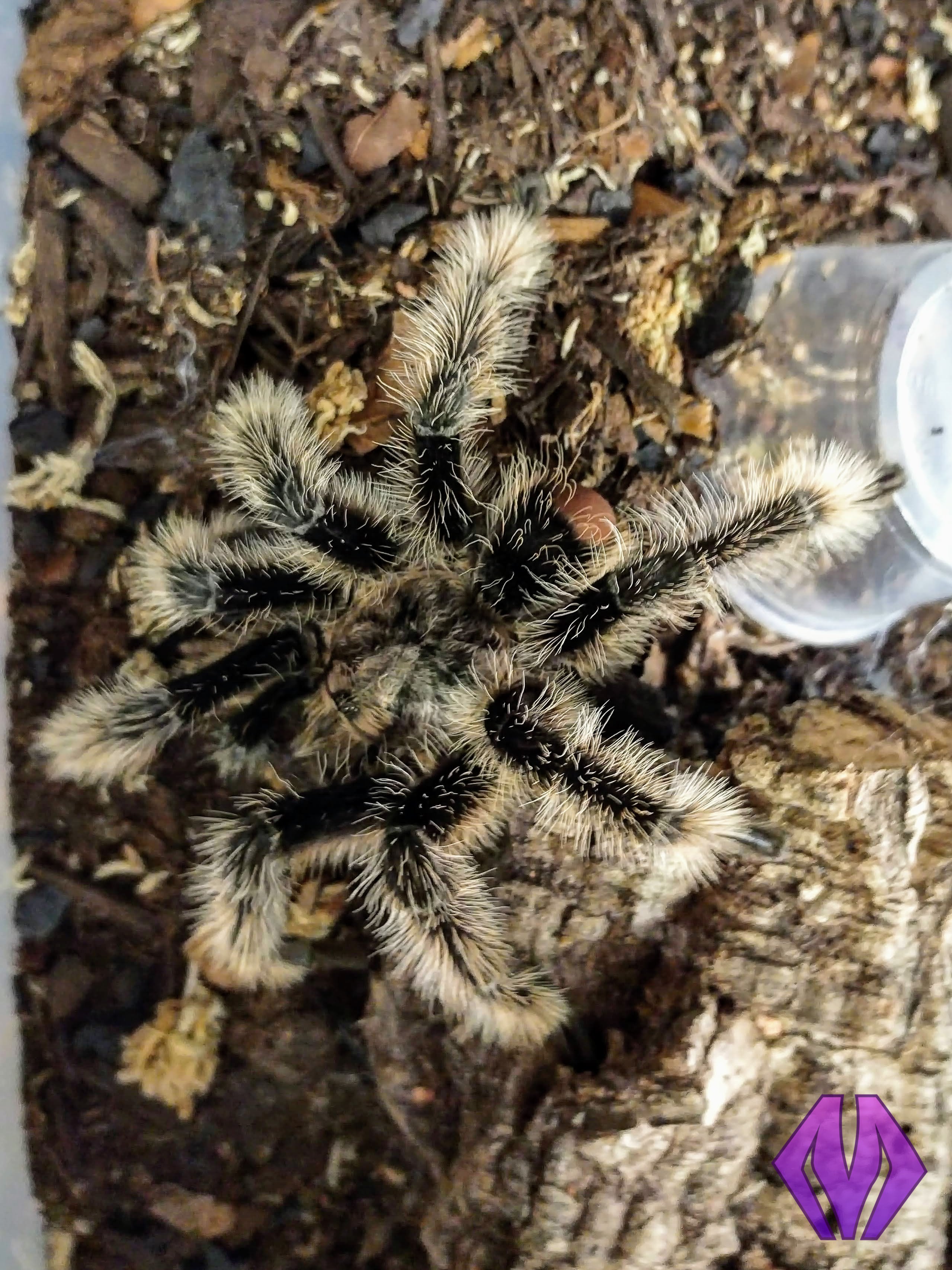 At Marshall Arachnids, we strive to take each species’ natural history into account when designing and maintaining vivaria for our spiders. We provide our T. albo adults with a daily thermal gradient of about 72 to 82°F, with the top of the enclosure being the warmest. Nighttime temps drop no lower than 70°F. Each spider has the opportunity to thermoregulate by moving around the enclosure as they please. Being a primarily fossorial species, curly hairs will likely burrow down to escape heat. We ensure the water dish is full and clean daily with a light misting once or twice per week. We add water to the substrate regularly to maintain live plants. For adults, we tong-feed appropriately-sized live dubia roaches or crickets every 7-14 days, but not on a set schedule. For slings, we offer food approximately every 5-7 days or as-needed. T. albos tend to lay down a thin mat of webbing when preparing to molt and may repeatedly refuse to eat. These spiders can safely go weeks on end without food, so do not be concerned if this is the case. Just continue to provide clean water regularly.