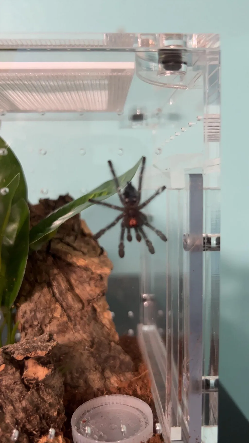This beautiful sling came to me with a healthy abdomen size and a spunky personality. We are already doing shenanigans together. He loves his cork hide and started webbing it up and digging a bit on his first night with me, and I love seeing what he's done each day. Happy to have my 2nd H. pulchripes, he did not disappoint! The handling was incidental, do not recommend with this species, but I got such a great shot of how gorgeous he is. Definitely shenanigans happening around here. :)